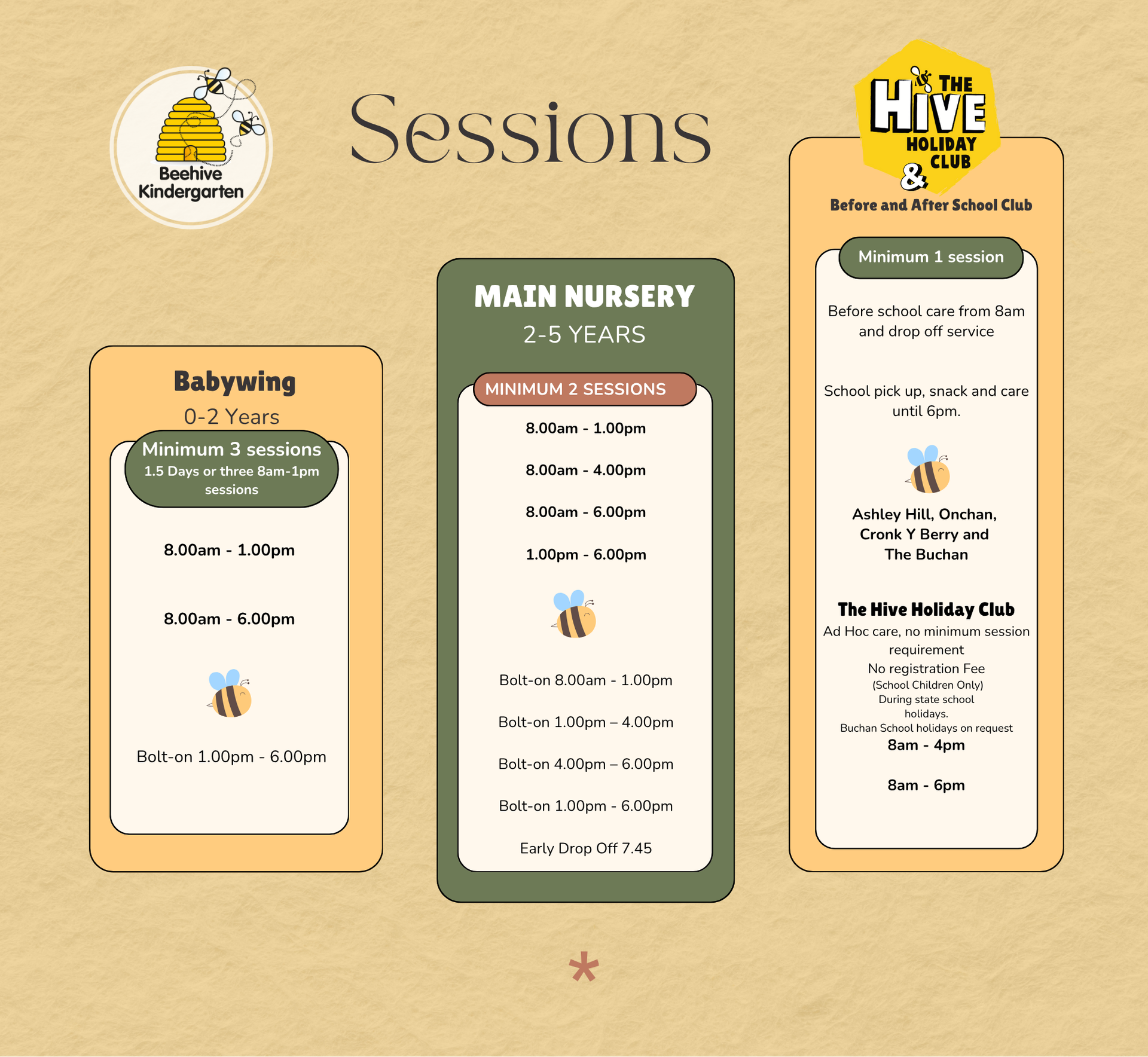 The Beehive accommodates additional sessions and bolt on hours, and you may book your child into an additional session/bolt on hours, subject to availability. Please note, bolt on sessions are charged at a higher rate than the permanent session fee. Once additional/bolt-on sessions have been booked these sessions cannot be cancelled and payment still needs to be made even if the session is not attended. We advise parents to set up a standing order for their child’s permanent session fees and all fees are due in advance. Please be aware, we charge £10.00 for each 15 minutes or part thereof when children are dropped off early at late notice on the day or picked up late. These charges will automatically be added to the invoice.